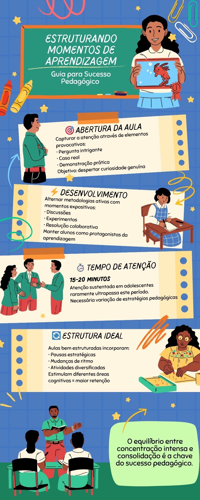Assim sendo, aulas bem estruturadas incorporam pausas estratégicas, mudanças de ritmo e atividades diversificadas. Consequentemente, estimulam diferentes áreas cognitivas, garantindo maior retenção do conteúdo apresentado.