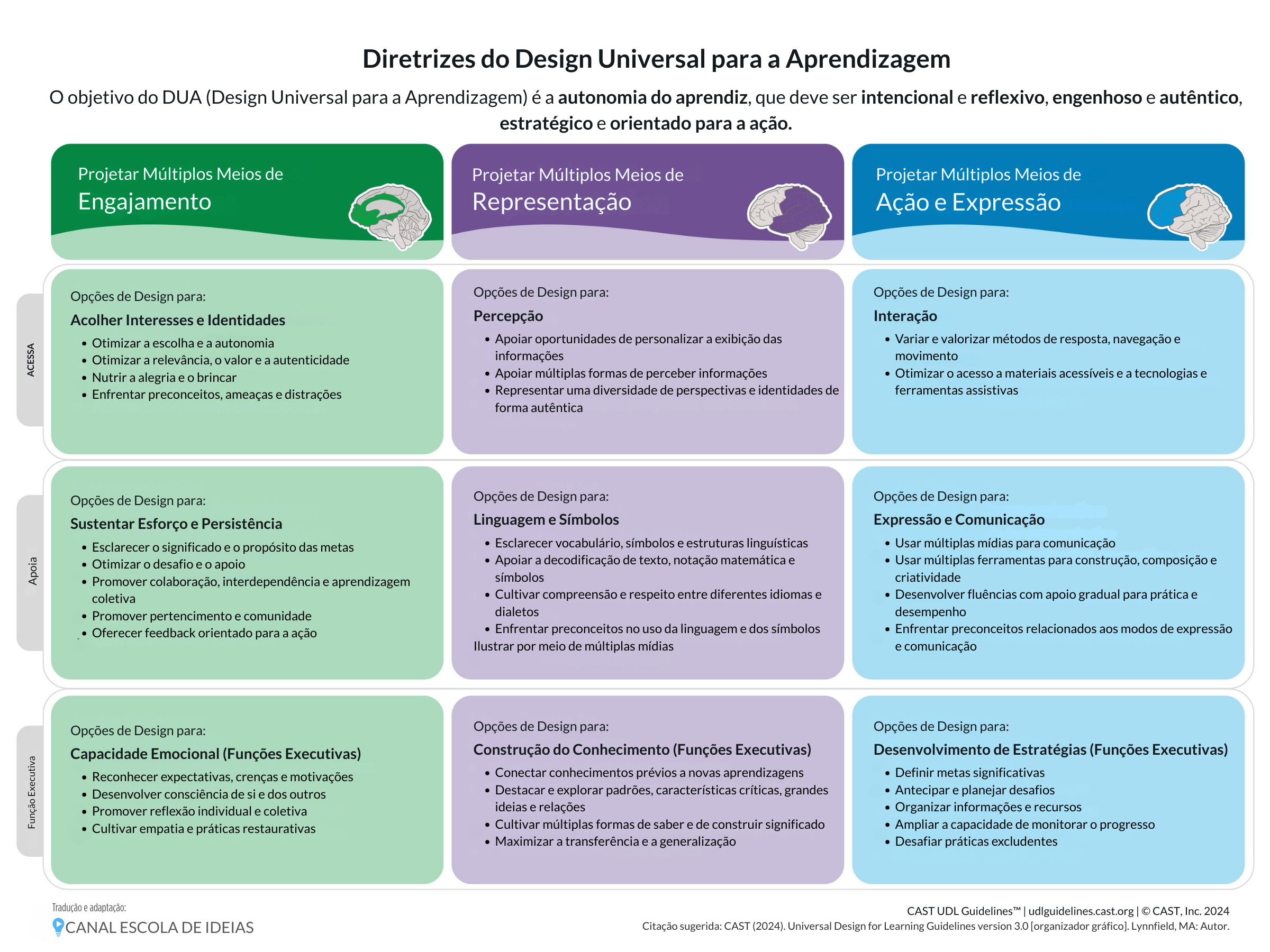 O Desenho Universal para Aprendizagem é um framework educacional desenvolvido pelo Center for Applied Special Technology (CAST) nos Estados Unidos durante a década de 1990. Em essência, o DUA fundamenta-se na neurociência e reconhece que não existem alunos “médios” — cada cérebro é único em sua forma de processar informações. Consequentemente, essa abordagem propõe que o planejamento pedagógico considere desde o início a variabilidade natural dos estudantes.